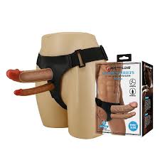 Capa para prótese realística com penetração dupla — acompanha cinta com alças elásticas que se adaptam facilmente a qualquer grossura de perna e quadril.